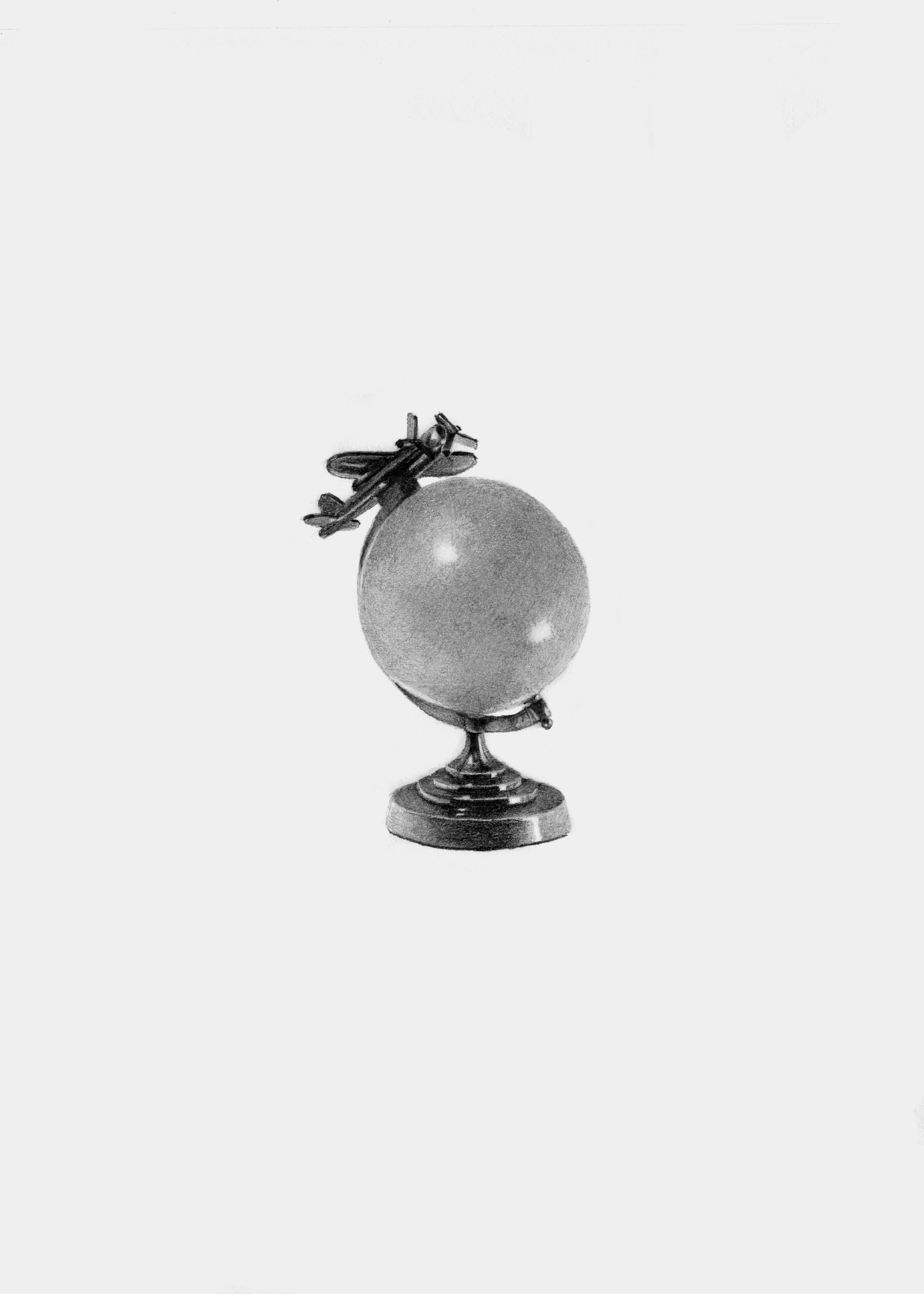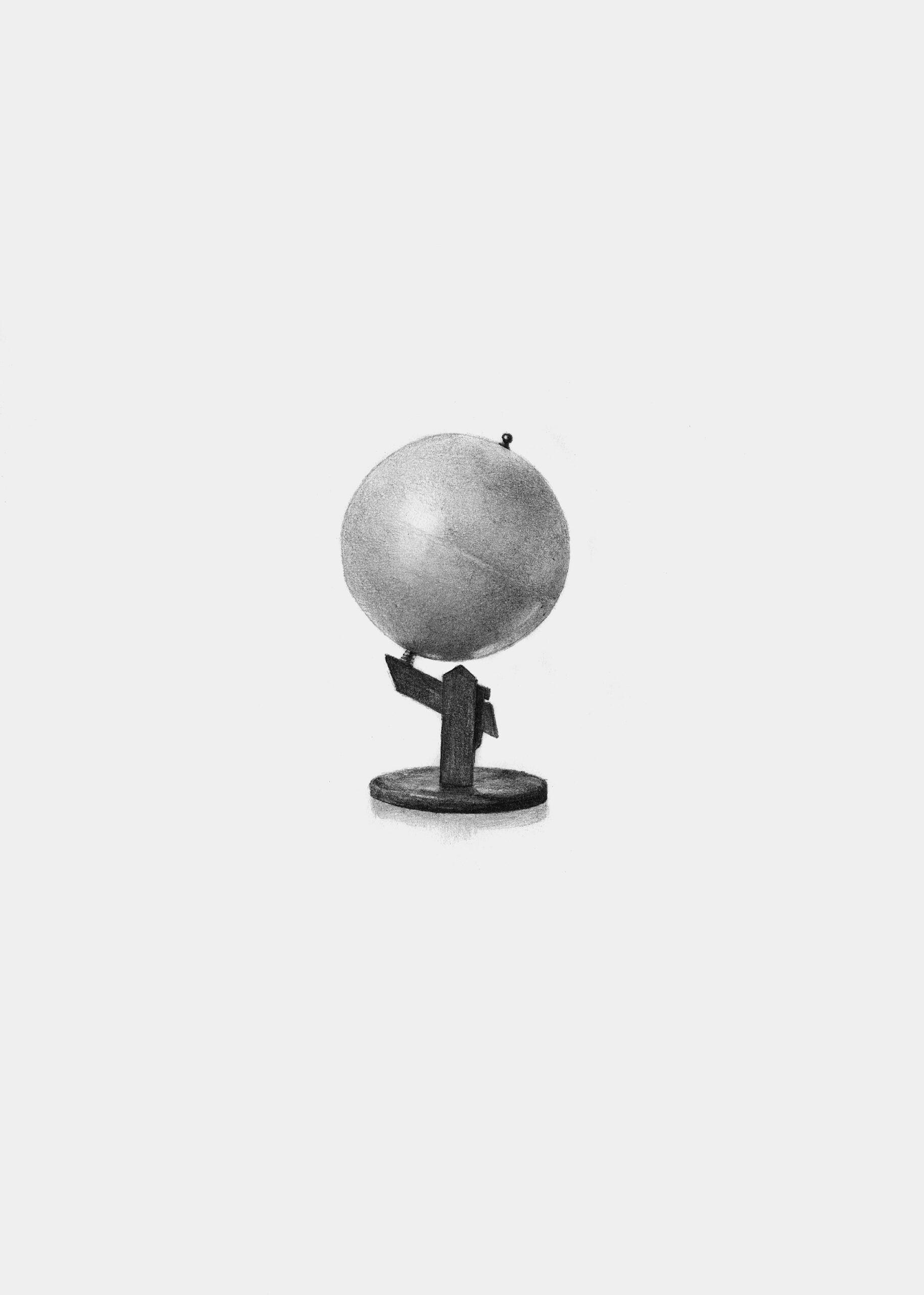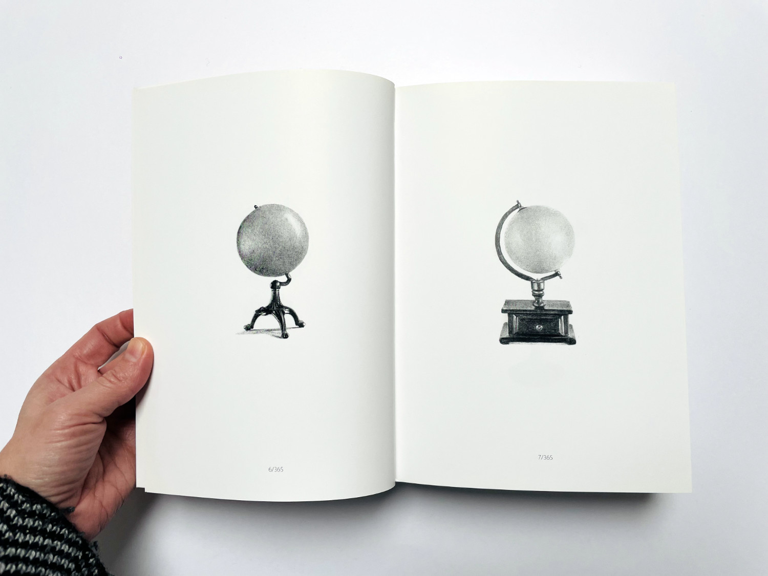 A work made of 365 drawings of different globes, created as one-drawing-per-day during 2015. The drawings are based on real globes seen in shops, museums, books, or the internet. The globe themselves, of same size and position on the paper, are drawn without any cartographical details, as if suggesting an unexplored or post-apocalyptic world. There is also a 366th globe drawing, created to be included on leap years only. A limited edition print of this leap globe and an artist book of the full collection are available (scroll down for more details).