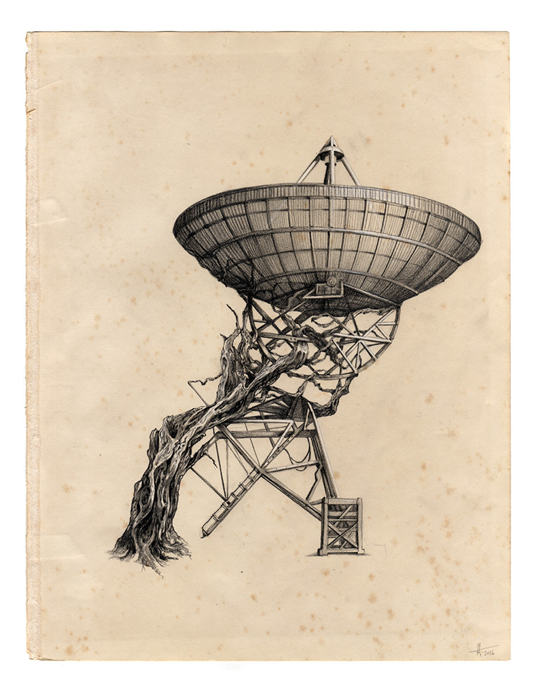 Work inspired by Jodrell Bank’s history, its relationship with its surrounding landscape and its significant role in the exploration of the Universe. Originally commissioned by Macclesfield Barnaby Arts Festival in collaboration with Jodrell Bank. These drawings suggest impossible hybrids between nature and human-made structures. The aged paper gives the drawings a fictional temporality, evoking botanical illustrations.