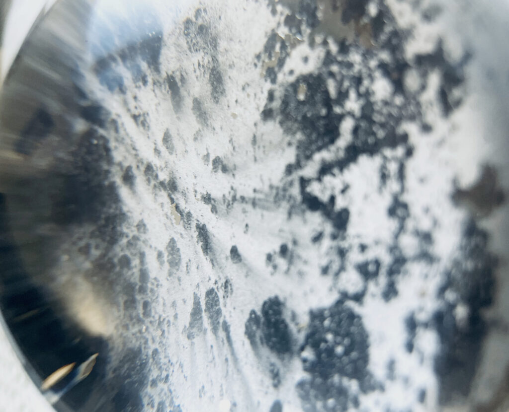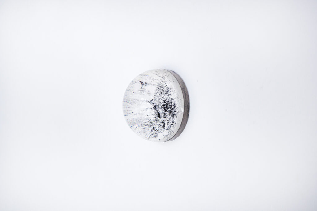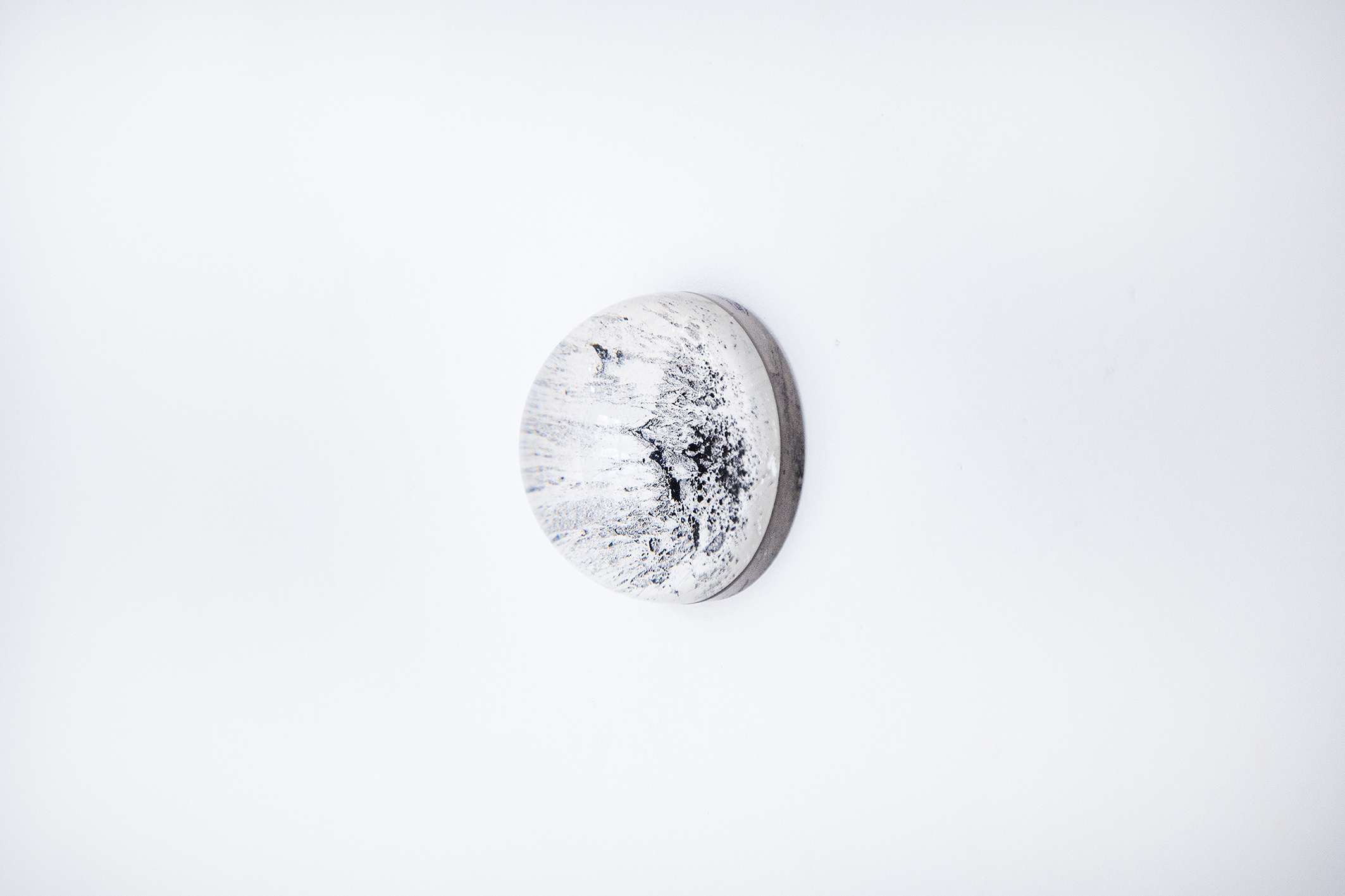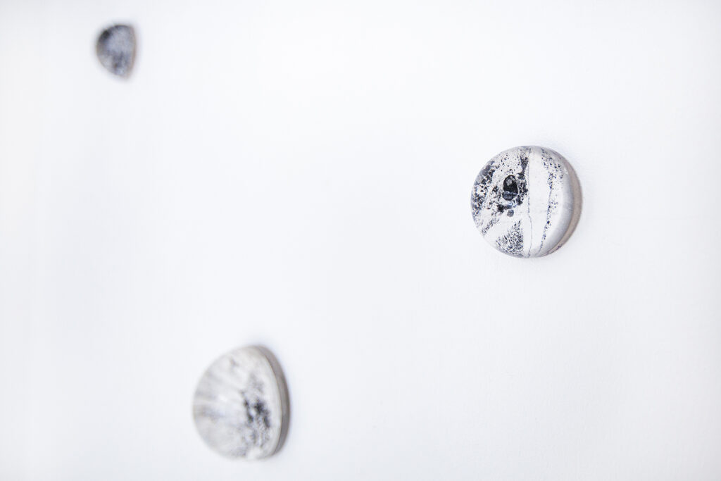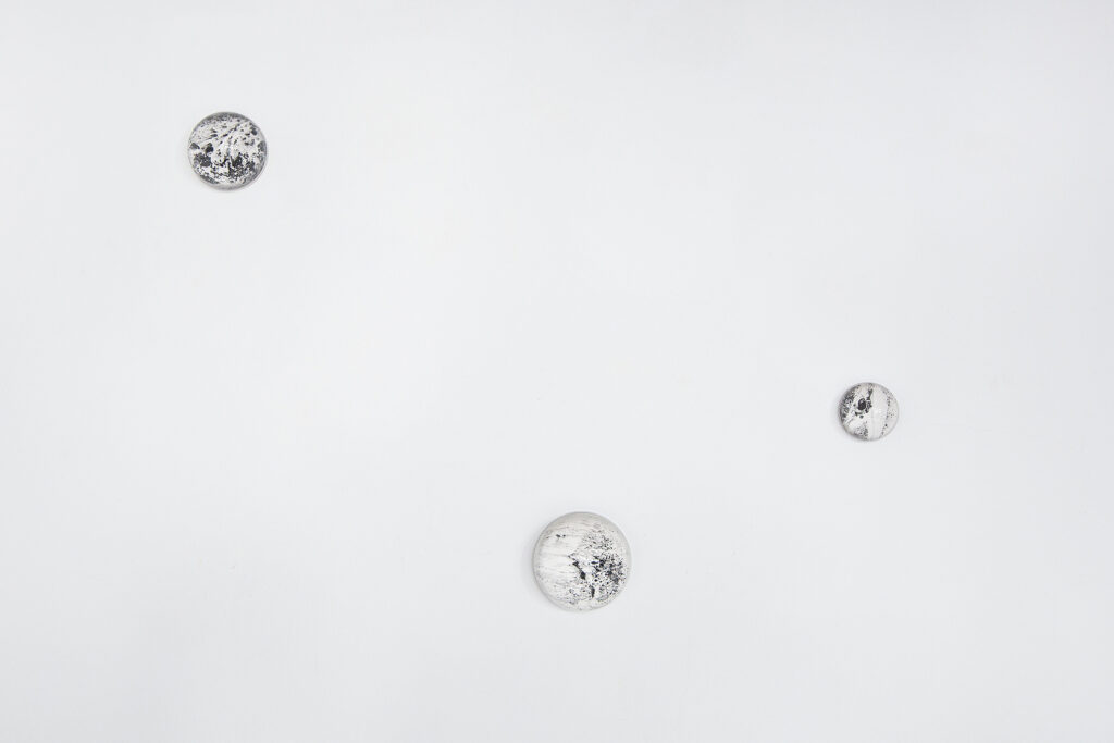 Drawings encapsulated beneath glass domes. Made with powdered graphite, each invites a slow, intimate and necessarily partial way of looking. The work draws on the story of Percival Lowell and his maps of the supposed canals of Mars, as well as the imaginative projections that early planetary images inspired among nineteenth-century astronomers. The circular format evokes both celestial spheres and the vitreous body of the eye — an organ that filters, and sometimes distorts, the reality it seeks to apprehend. The glass dome becomes both protective cover and optical device, turning the act of viewing into a small experiment in perception; the lens’s reflections and subtle distortions become part of the drawings’ suggested rocky, sedimentary and fractured terrains.